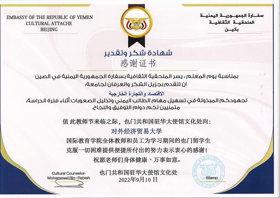 احتفلت الملحقية الثقافية الجمهورية اليمنية في جمهورية الصين الشعبية، بيوم المعلم الصيني، وذلك عبر إرسال شهادات شكر وتقدير لـ43 جامعة صينية يدرس فيها طلاب يمنيون.