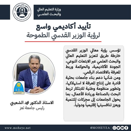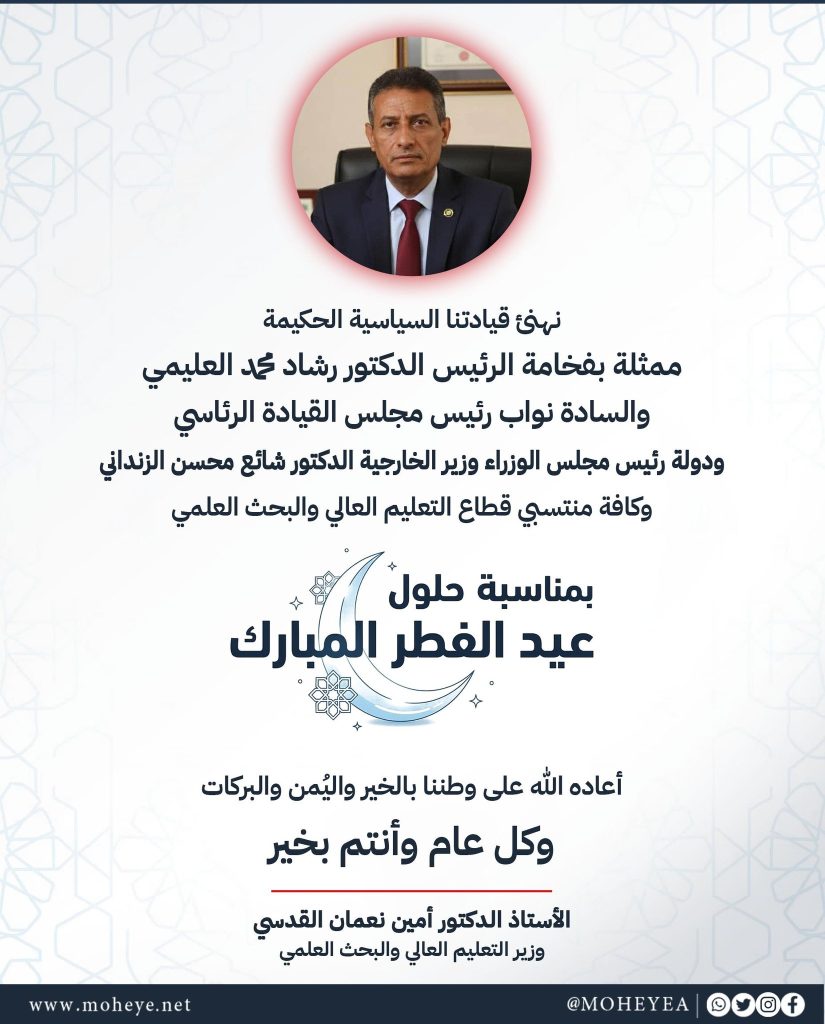 وزير التعليم العالي يهنئ القيادة السياسية ومنتسبي القطاع الأكاديمي بمناسبة عيد الفطر المبارك